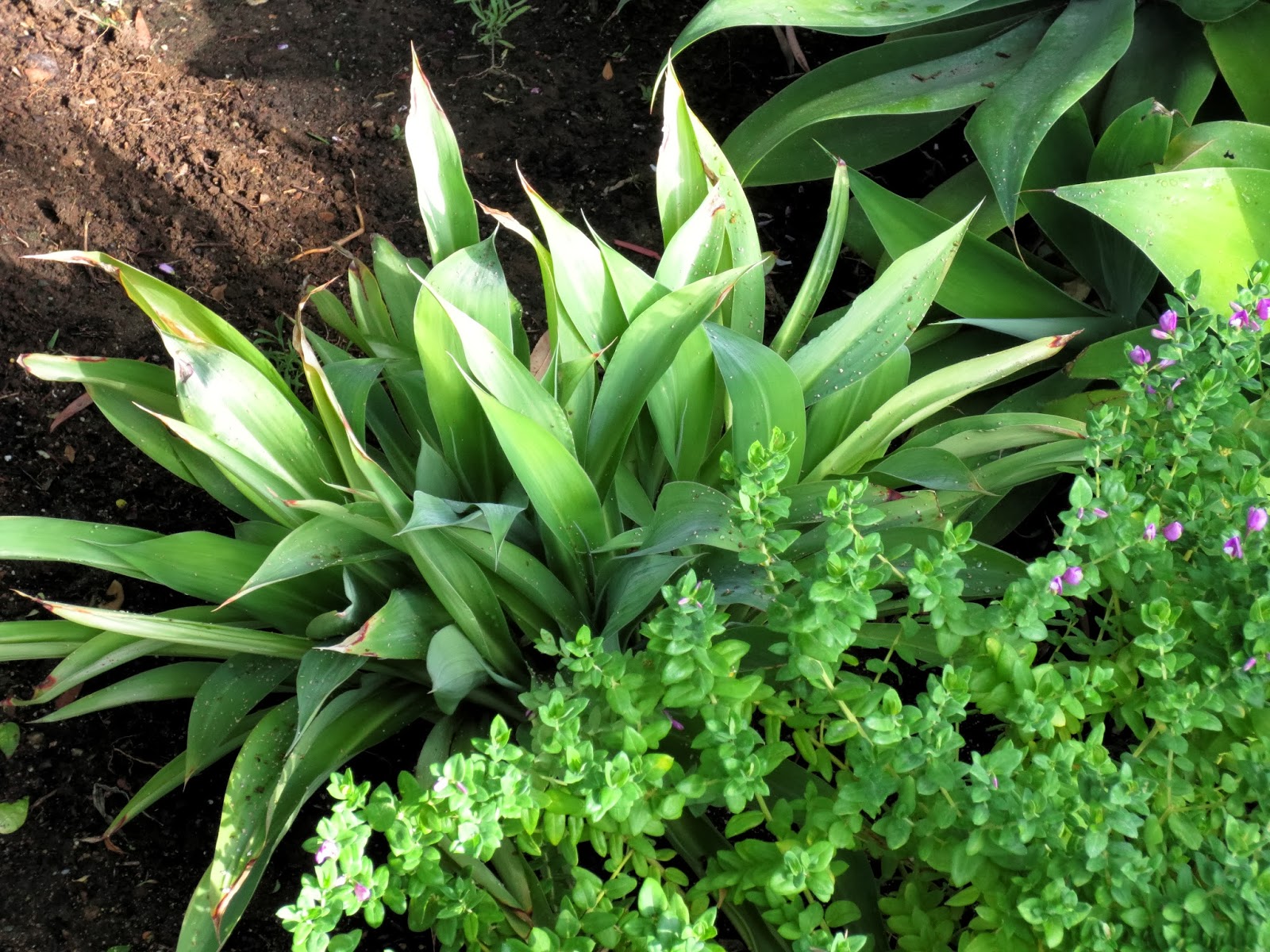| The foliage of the Renga lily looks like a smaller version of the Agave attenuata to the right of it |