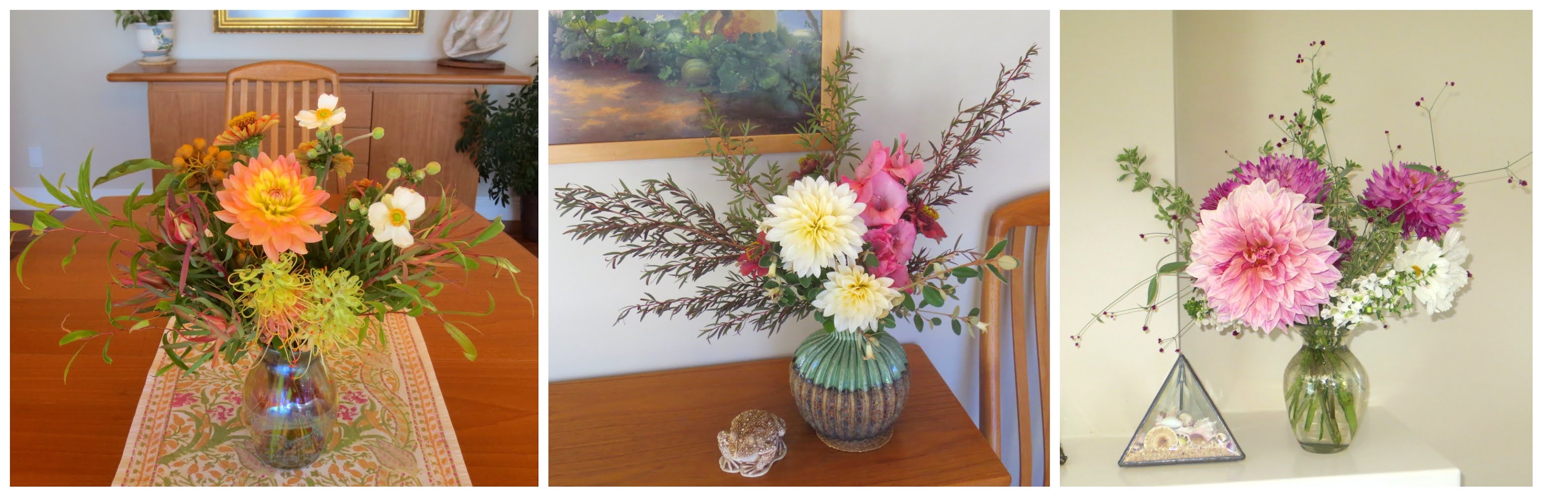 The two blooms of Dahlia 'Cafe au Lait Royal' I'd already cut ended up in a third arrangement, with a few stems of Dahlia 'Enchantress' thrown into the mix to flesh it out. Once 'Enchantress' starts blooming, she never hits the pause button.