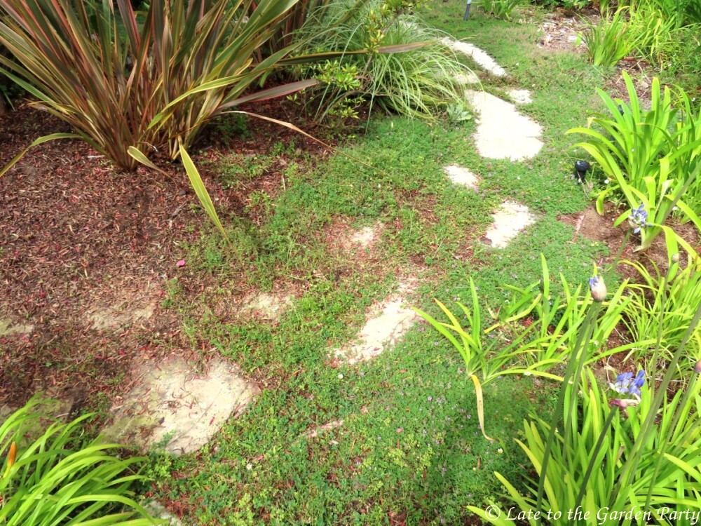 | Much of the area between and surrounding the flagstones had been planted with creeping thyme but I tried to weed out stems that crept into the thyme while leaving it in place where I could |
